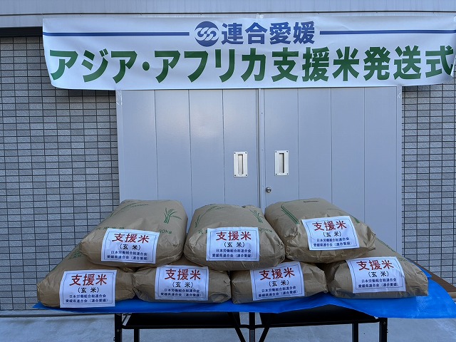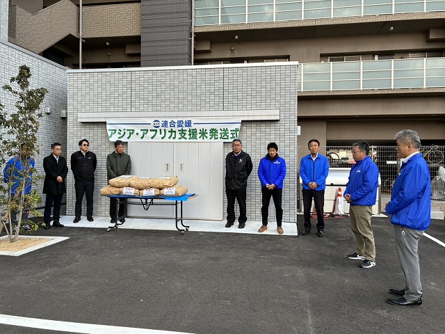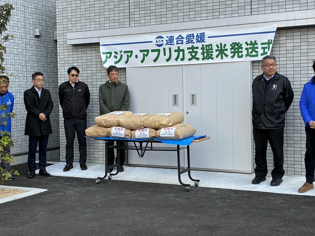 12月5日(金)、四国ろうきん松山ビル駐車場において14名が参加し、アジア・アフリカ支援米の発送式を行いました。