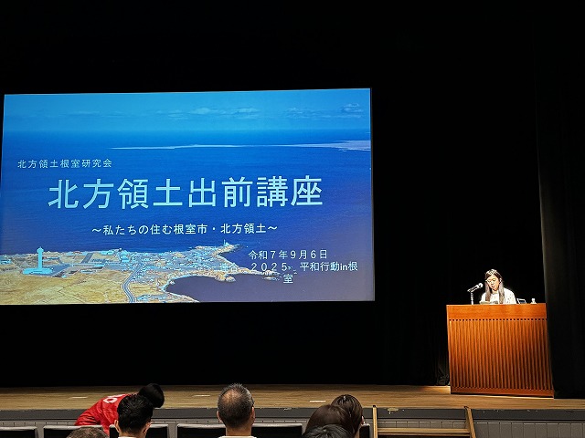 9月6日(土)、根室市総合文化センターで開催された「北方四島学習会」では、第1部で、北海道根室高等学校 北方領土根室研究会の久保こころさんから「北方領土をめぐるこれまでの議論と北方領土根室研究会のこれまでの取り組みについて」と題して講演がありました。中・高生に向けて出前講座を行なったり、各種団体との交流や署名活動、14年目を迎えた地元FMラジオ番組など、元島民の高齢化が進む中、領土問題や活動を幅広い世代に知ってもらい、次世代に継承できるよう全国に向けて情報発信している研究会の様々な取り組み報告がありました。