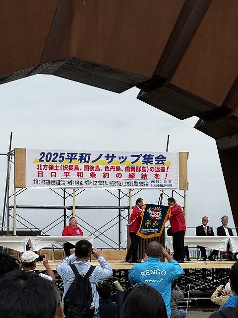 その後ピースリレーが行われ、北海道(連合北海道)から平和4行動のスタートの地 沖縄(連合沖縄)へピースフラッグが受け渡された後、集会アピールを参加者全員の拍手で採択し、最後に北方領土早期返還を願って、力強いがんばろう三唱で締めくくりました。